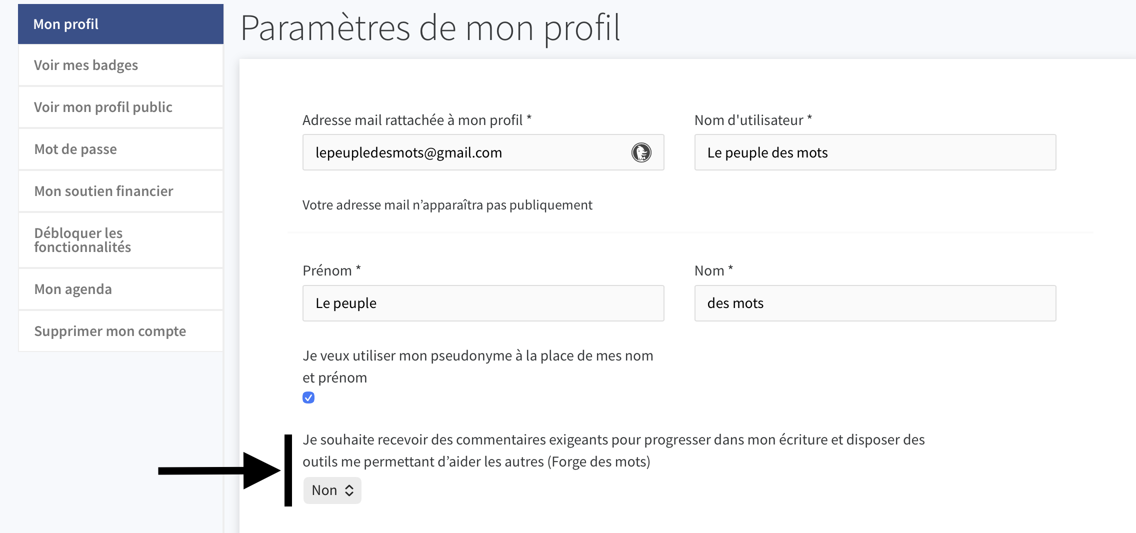 Pour participer à "La forge des mots", rendez-vous dans « Gérer mon compte » et mon profil.