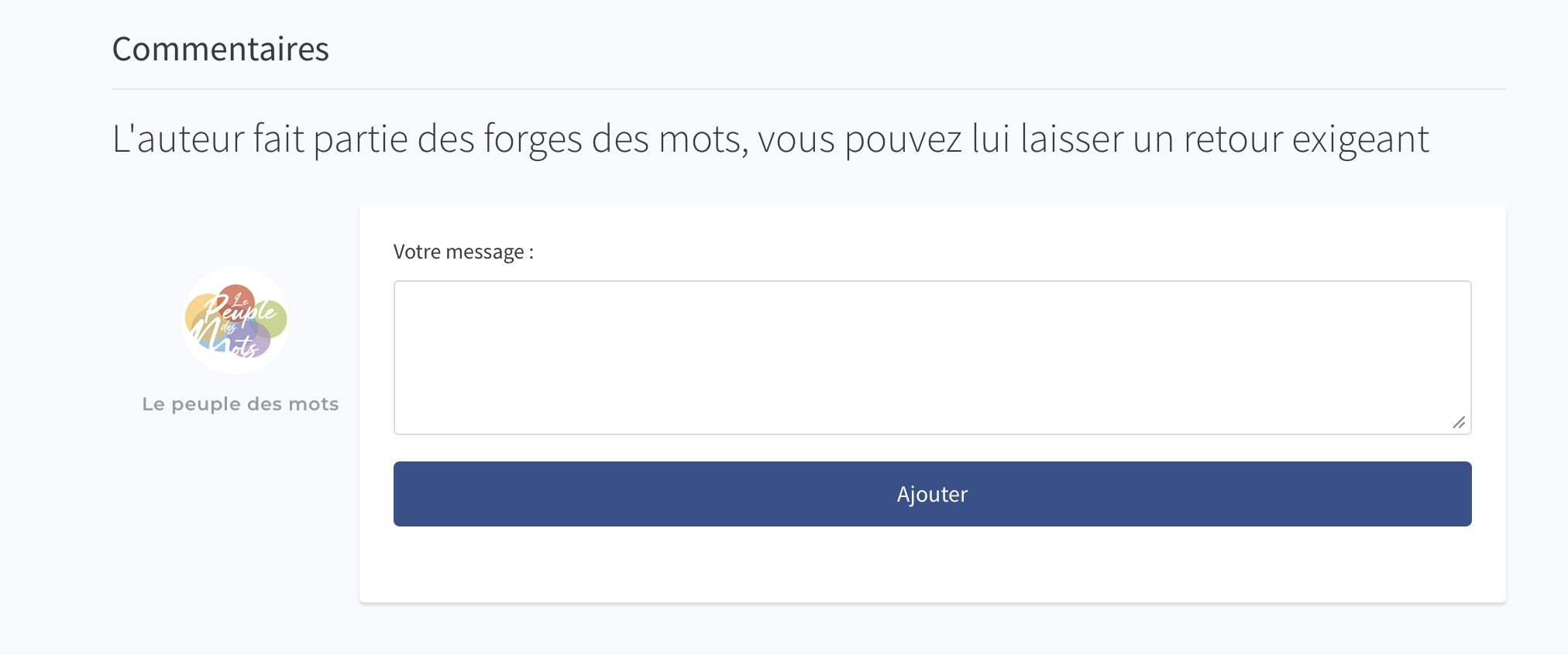 Au-dessus de chaque commentaire que vous laisserez sur un texte que vous commenterez via le fil de lecture, vous saurez si la personne fait partie ou non de la forge des mots. Si vous voyez bien la mention "L'auteur fait partie ds forges des mots, vous pouvez lui laisser un retour exigent", soyez libre de laisser un retour argumenté et rigoureux, ce qui n'empêche pas d'être bienveillant et d'y mettre les formes. Exigeant ne veut pas dire être froid ou méchant.